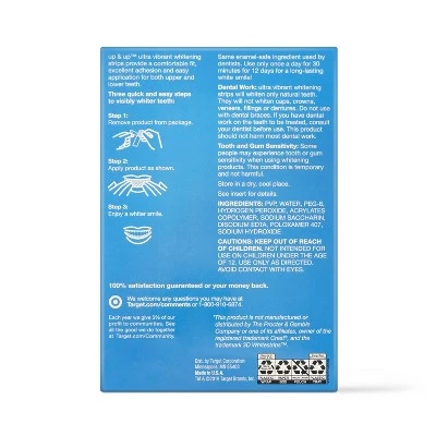 Get visibly whiter teeth with up & up Ultra-White Whitening Strips. Compare to Crest 3D Whitestrips, Vivid White. These whitening strips feature the convenient EasyFit design which provides a comfortable fit, excellent adhesion, and easy application for both upper and lower teeth. In just 30 minutes per day, you can enjoy noticeably whiter teeth. These No Mess Dry Touch whitening strips remove stubborn coffee, wine, and smoking stains, all without any messy trays or gels. Use this product every 3 months or as needed. Contains the same enamel-safe ingredient used by dentists. Perfect for a wedding or prom.