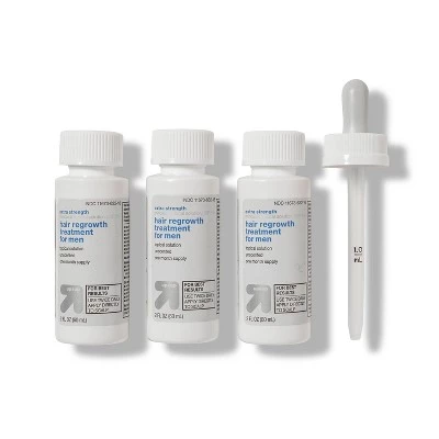 Compare to Menβs Rogaine Extra Strength active ingredient. Up&Up Minoxidil Topical Solution 5%, Hair Regrowth Treatment for Men is an unscented, easy-to-use topical treatment that revitalizes hair follicles and is clinically proven to help regrow hair. It is for men who have a general thinning of hair on the top of the scalp. Not for use by women.