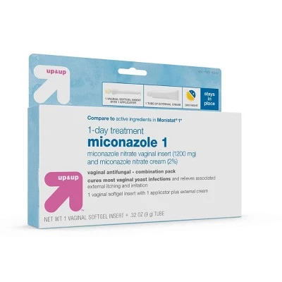 Compare to the active ingredients in Monistat 1 Combination Pack. Vaginal health is an important aspect of womenβs overall health. When things get uncomfortable down there, you can find the relief you need with Up&Up 1-Day Treatment Miconazole 1, Miconazole Nitrate Vaginal Insert (1200 mg) and Miconazole Nitrate Vaginal Cream (2 Percent). This 1-day treatment plus external cream cures most vaginal yeast infections and relieves associated external itching and irritation. This feminine hygiene product includes 1 vaginal softgel insert, 1 comfortable flexible suppository applicator plus external cream for itch relief.