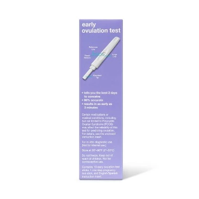 The up & up Early Ovulation+Pregnancy Test detects an increase in luteinizing hormone (“LH surge”) in urine, which usually occurs 24-48 hours before ovulation on the days when you are most able to become pregnant. The Ovulation Test is easy to use in two simple steps, and you can take the test any time of day. Just hold the absorbent tip downward in your urine stream for five seconds only, return the cap, and lay the test on a flat surface. If the LH Surge line is the same color as, or darker than, the Reference Line, you should ovulate within the next 24-36 hours. It is best to have intercourse within the next 48 hours to maximize your chances of conception. This kit contains 10 ovulation tests and one pregnancy test. The up & up One Step pregnancy test is over 99% accurate from the day of your expected period*. For clear, easy-to-read results, choose the up & up Early Ovulation+Pregnancy Test. Please read instructional insert carefully before use.